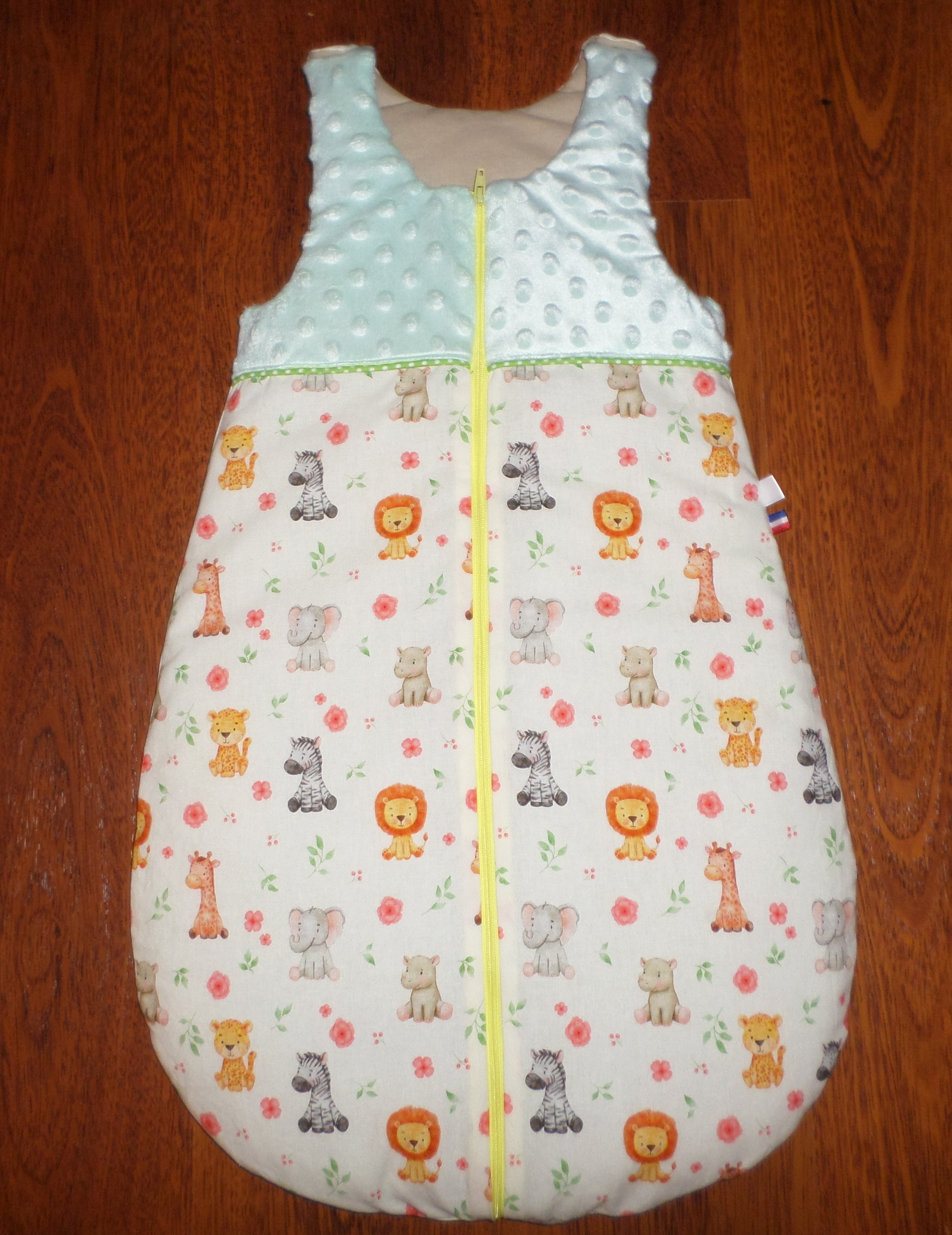 Face extérieure en minky et coton imprimé, face intérieure en coton unis, ainsi qu'une couche de molleton entre les deux tissus. il y a deux pressions sur les épaules et un grand zip sur le côté.
