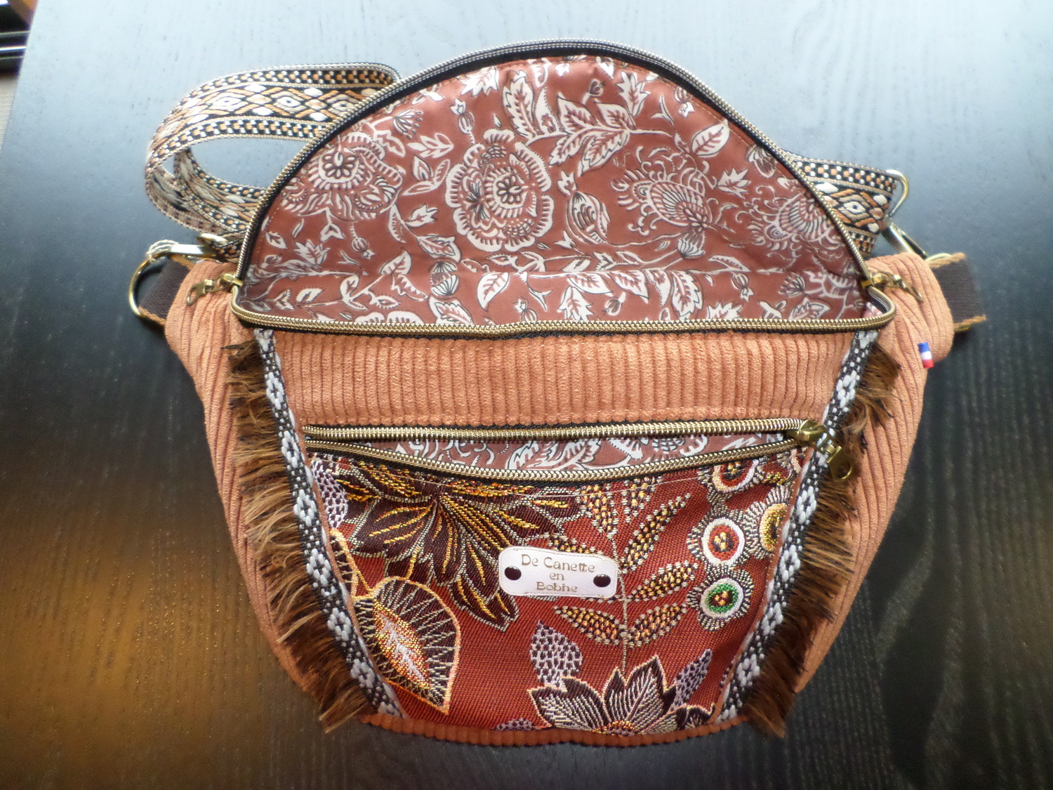 Sac banane confectionné avec un tissu jacquard sur le devant, un simili sur les cotés et un coton imprimé pour la doublure.