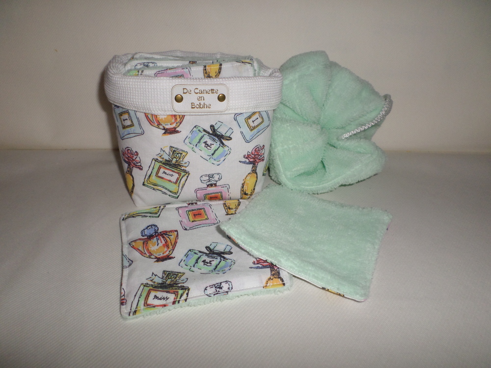Corbeille avec ses 8 lingettes et une fleur de douche en éponge de bambou
