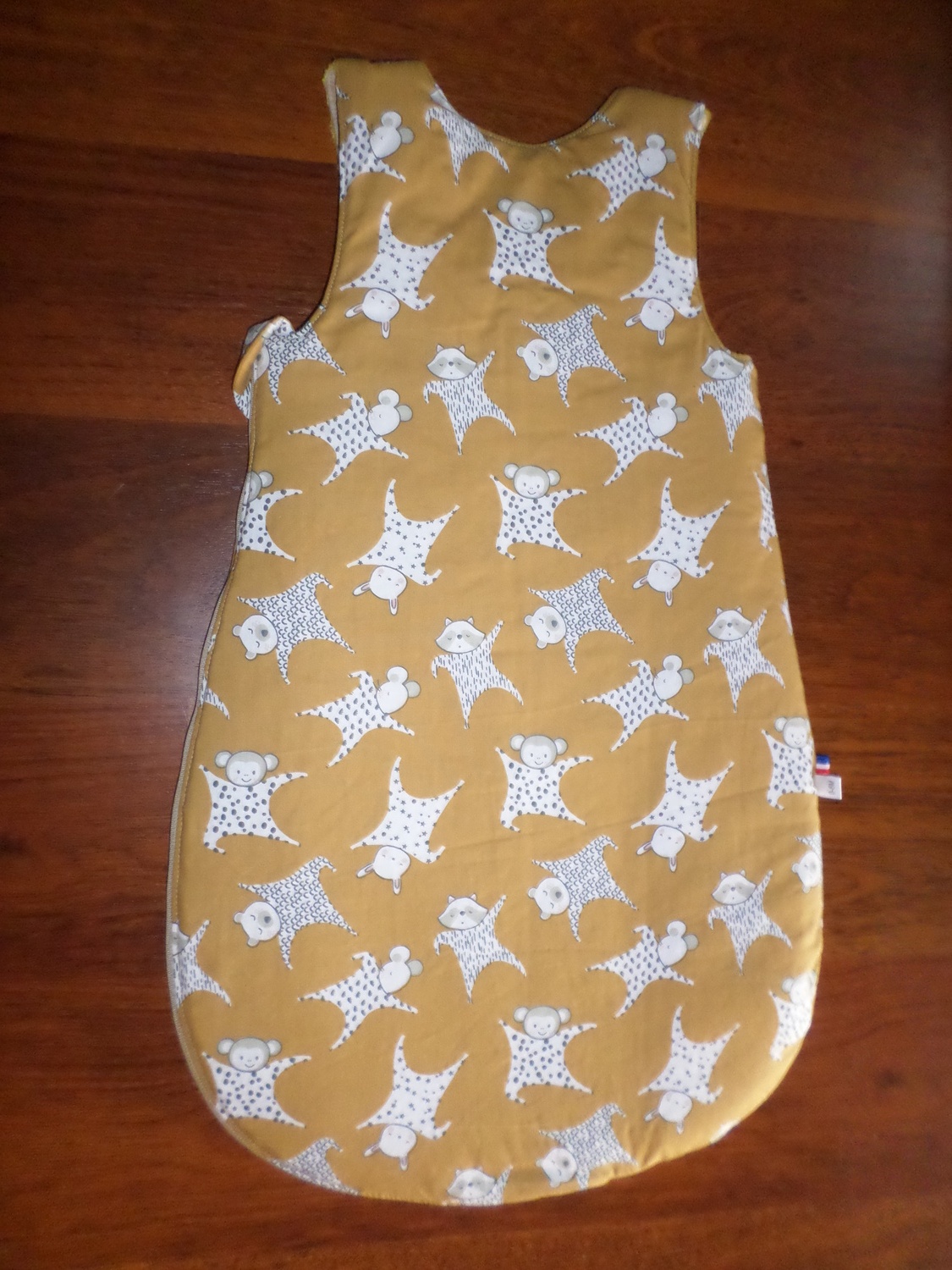 Face extérieure en minky et coton imprimé, face intérieure en coton unis, ainsi qu'une couche de molleton entre les deux tissus. il y a deux pressions sur les épaules et un grand zip sur le côté.