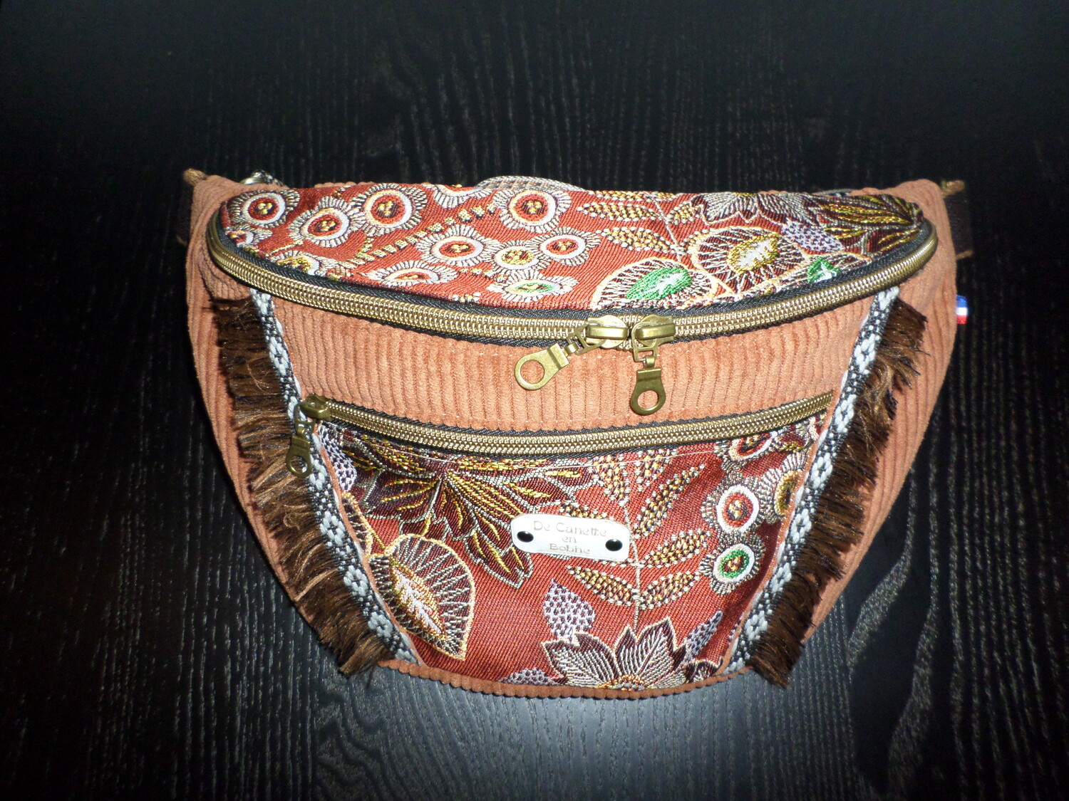 Sac banane confectionné avec un tissu jacquard sur le devant, un simili sur les cotés et un coton imprimé pour la doublure.