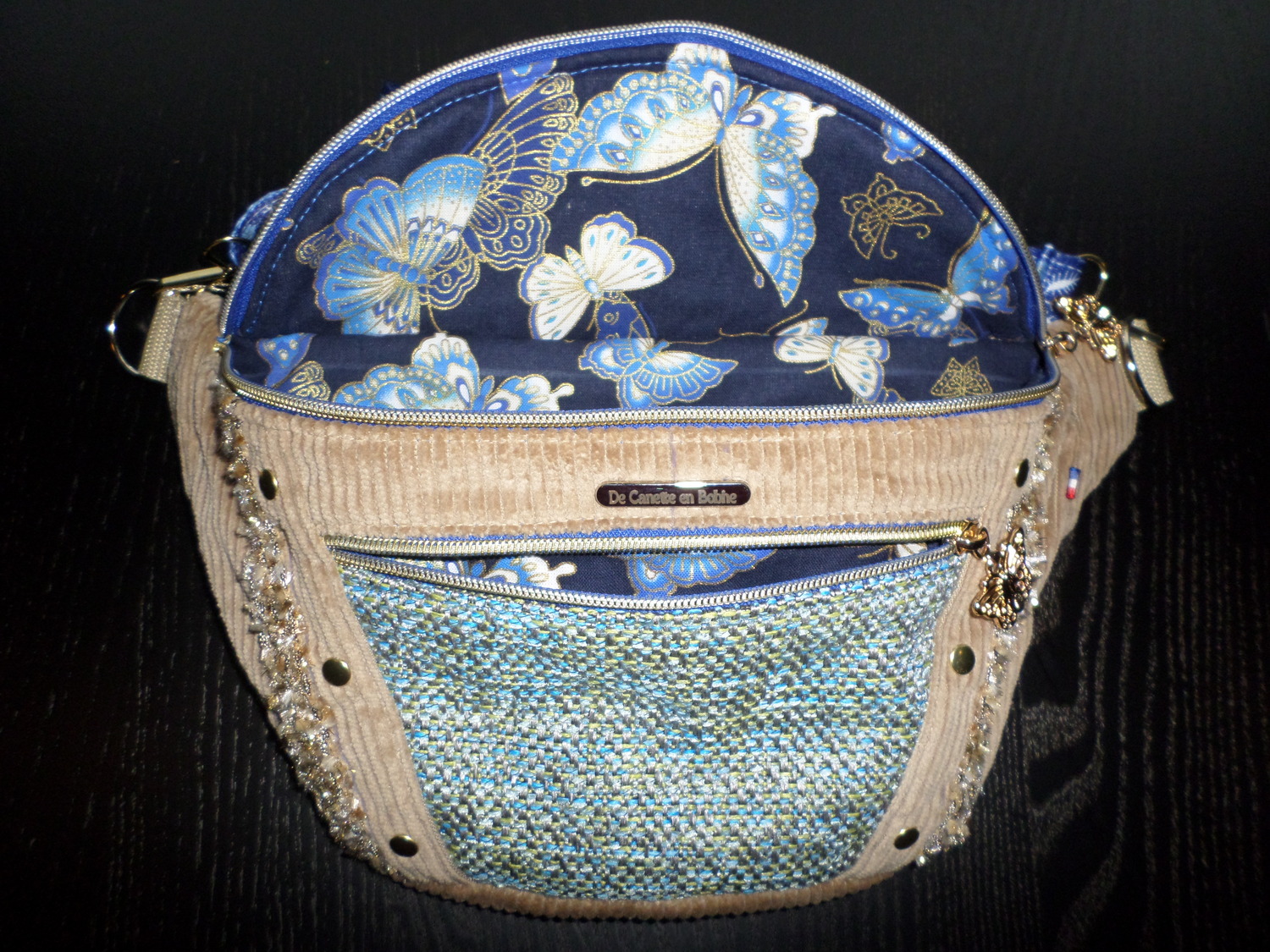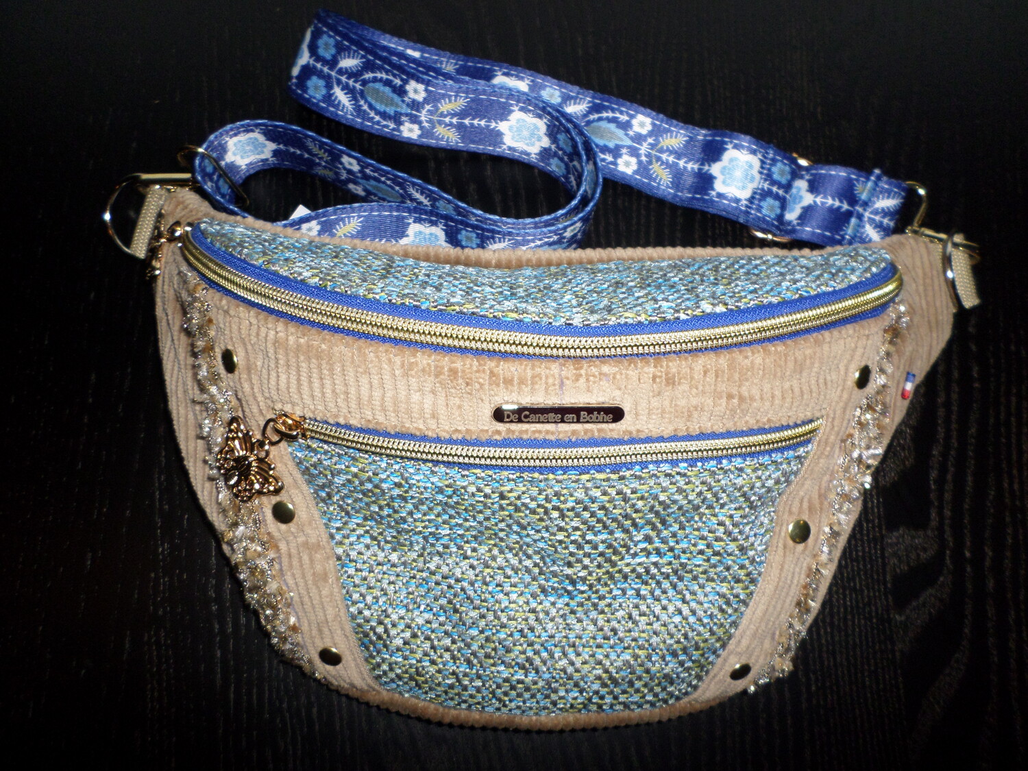 Sac banane confectionné avec un tissu jacquard sur le devant, un simili sur les cotés et un coton imprimé pour la doublure.